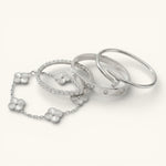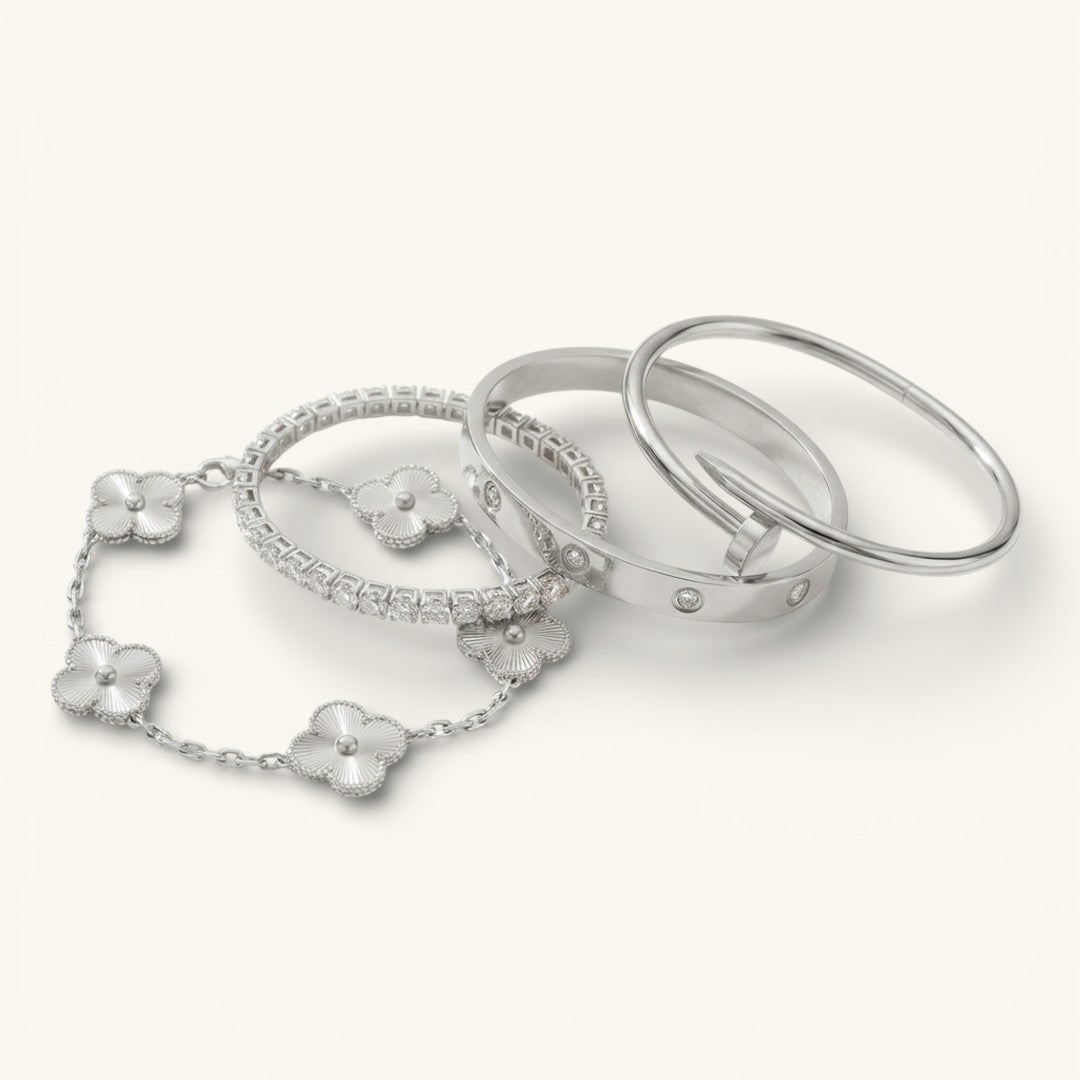 Shimmer in with the Elegance Deluxe Stack—a luxurious quartet of bracelets designed for timeless elegance and modern versatility. Perfect for stacking or wearing solo, this collection combines understated charm with bold sophistication, elevating any outfit effortlessly.