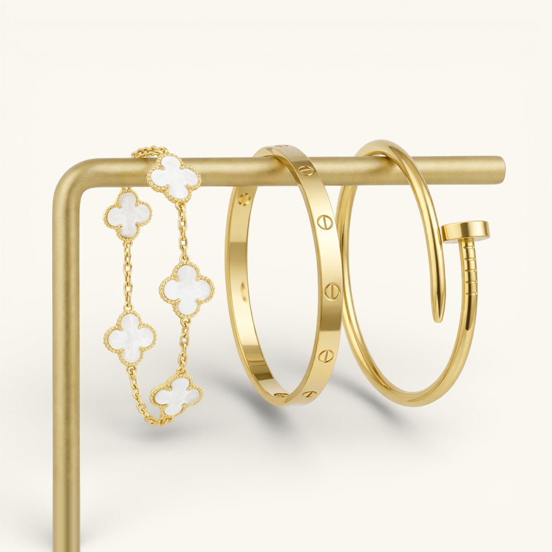• Trinity & Clover Bracelet: A delicate and adjustable bracelet (16+5 cm) with charming details, available in gold or silver.