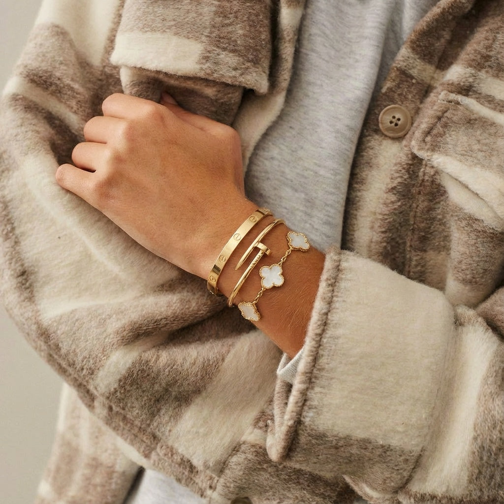 • Elegance Nail Bracelet: A bold and modern statement piece with a sleek nail-inspired design (one size).