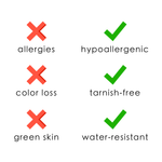 • Water, Sweat, and Heat Resistant. (No discoloration, No Tarnishing).
